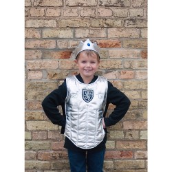 Medieval Knight Set with tunic and crown by Great Pretenders, made with great care for details. They shine as a real medieval armour but they're as comfy as a tracksuit! The tunic is size adjustable. Machine washable. Size: 4 - 6 anni