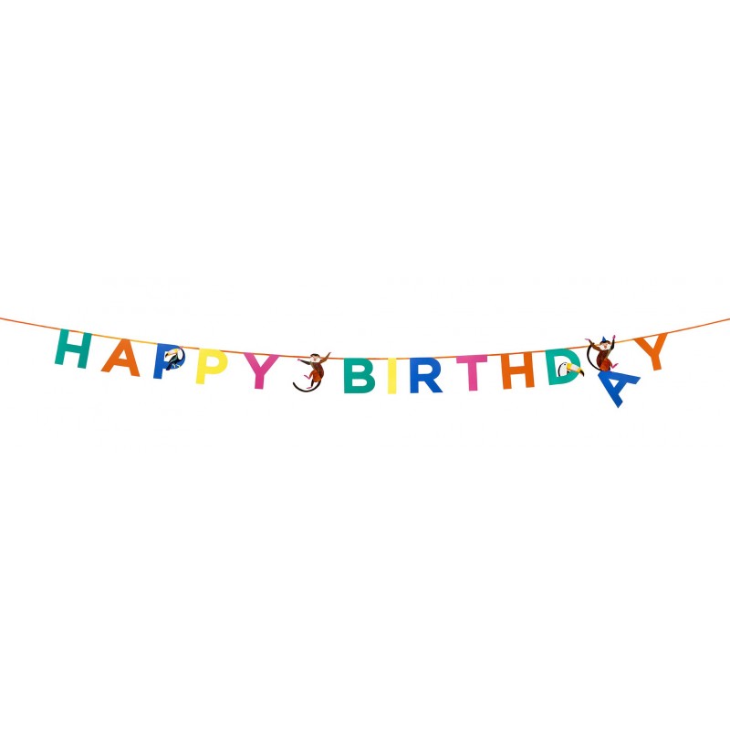 Party Animals Happy Birthday Garland, formed by multicolored cardboard letters and decorated with monkeys and toucans, wonderful to wish a very happy birthday in jungle themed parties! Match to other Party Animals range articles to complete the decoration.