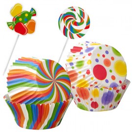 Colorful Wilton cupcake decorating kit with 50 baking cups and 24 sticks. Perfect for every birthday party! Dimension: 5 cm baking cups (standard size) Quantity: 50 baking cups and 24 sticks
