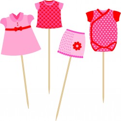 Set of picks in 4 different models of baby clothes to girls baby shower. Can be used for cupcakes, sandwichs or other food to easily decorate baby showers party table! Perfectly match to pink decoration! Dimension: 8 cm (total high) Quantity: 24