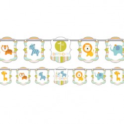 Happy Jungle paper flag banner with interchangeable 1st Birthday and Baby Shower flags. Use this adorable banner to decorate your Jungle themed party. Combine with other Happy Jungle Party items, accessories and decoration in the colours of your choice for a perfect decoration! Dimension: 2,2 m Quantity: 1