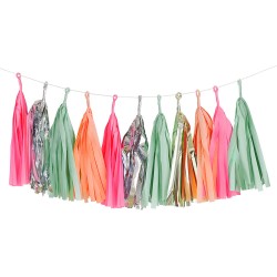 Wonderful party decoration, this tassel garland has an adorable combination of 20 tassels in pastel colors tissue paper (pink, peach and mint) and gold and silver foil. Can be placed in the wall or on your table. Dimension: 3 m Quantity: 1