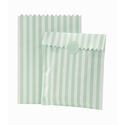 Wonderful set of striped mint and white paper treat bags and assorted stickers, great to decorate the party table and to donate treats or small favors as party souvenir. Dimension: 21 x 15 cm Quantity: 10