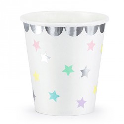 These white paper cups are decorated with pastel colors little stars and have a silver foil board. Simply adorable for baby showers and girls birthday parties. Perfect match to "Make a Wish" party range! Complete the decoration with pastel pink, blue and lavender accessories and decoration. Dimension: 180 ml Quantity: 6