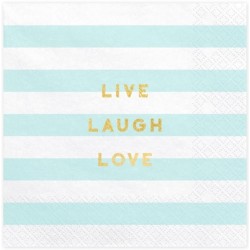 This lovely napkins in striped mint green color features a golden foil message "Live Laugh Love" in one side and a golden foil little heart in the other. Match to other mint and gold colored articles for a perfect decoration! Dimension: 33 x 33 cm Quantity: 20