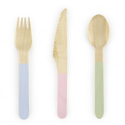 This mixed pastel colors wooden cutlery set is a natural and eco-friendly complement for every party. Dimension: 16 cm Quantity: 18 (6 forks, 6 spoons, 6 knives)