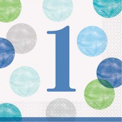 These blue and green dots paper napkins are lovely for boy's first birthday parties! Match to other articles from the same range, accessories and decoration in blue and green solid colors to create a wonderful decoration. Dimension: 33 x 33 cm Quantity: 16