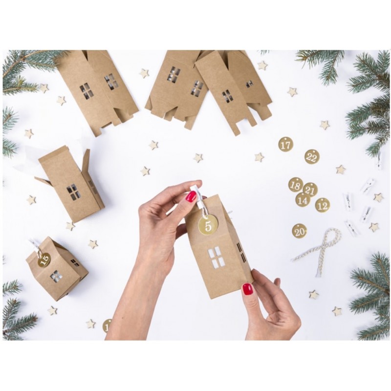 This original DIY Advent calendar is made up 24 kraft paper houses in 3 different designs which you can fill with your own gifts (size: from approx 5 x 11 x 5 cm to approx 7 x 11 x 5 cm). The set includes also 24 white wooden pegs, gold paper tags with printed numbers, 24 pieces of white and gold twine (approx 20 cm) and 24 of white tissue papers with gold dots pattern (approx 15 x 21 cm).
