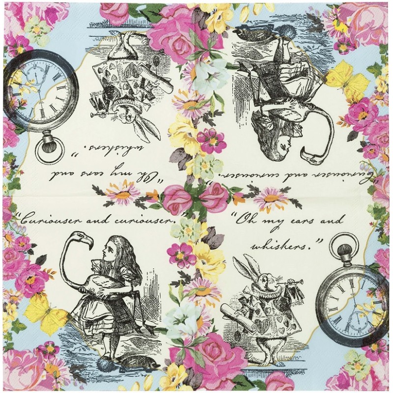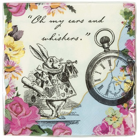 These lovely Alice in Wonderland themed paper napkins in 2 different designs, The White Rabbit and Alice, both adorned by a vibrant floral border, features images and phrases very representative of the tale. Combine with other Alice in Wonderland articles and decoration to create your party!