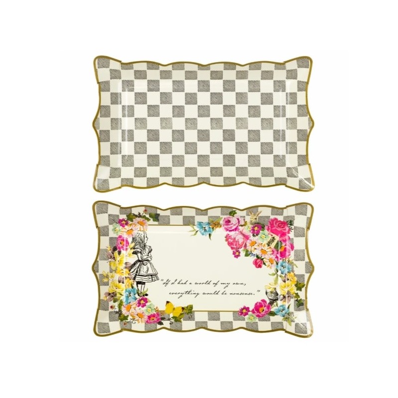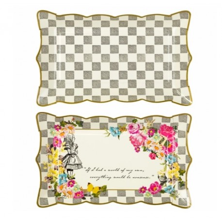These adorable Alice in Wonderland themed set of 4 paper food platters in 2 different designs features images and phrases very representative of the tale and is perfect for Alice in Wonderland party table! Combine with other Truly Alice articles and decoration to create your party!