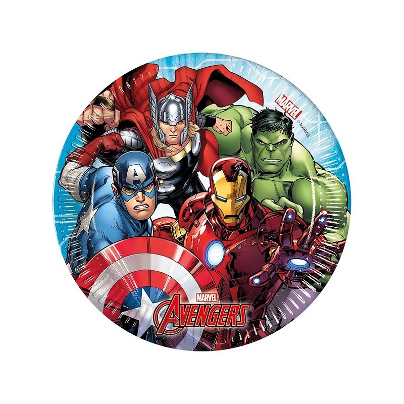 Avengers theme paper dessert plates for kids birthday party. Combine with other Avengers theme items, blue, green and red accessories and decoration!