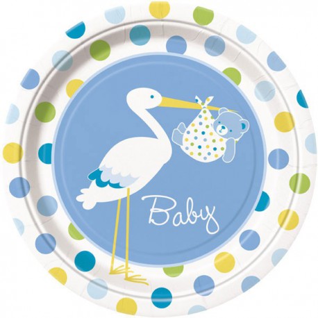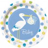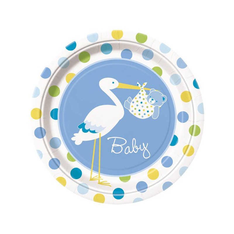 Lovely paper dinner plates from Baby Boy Stork range for boy's baby shower parties.