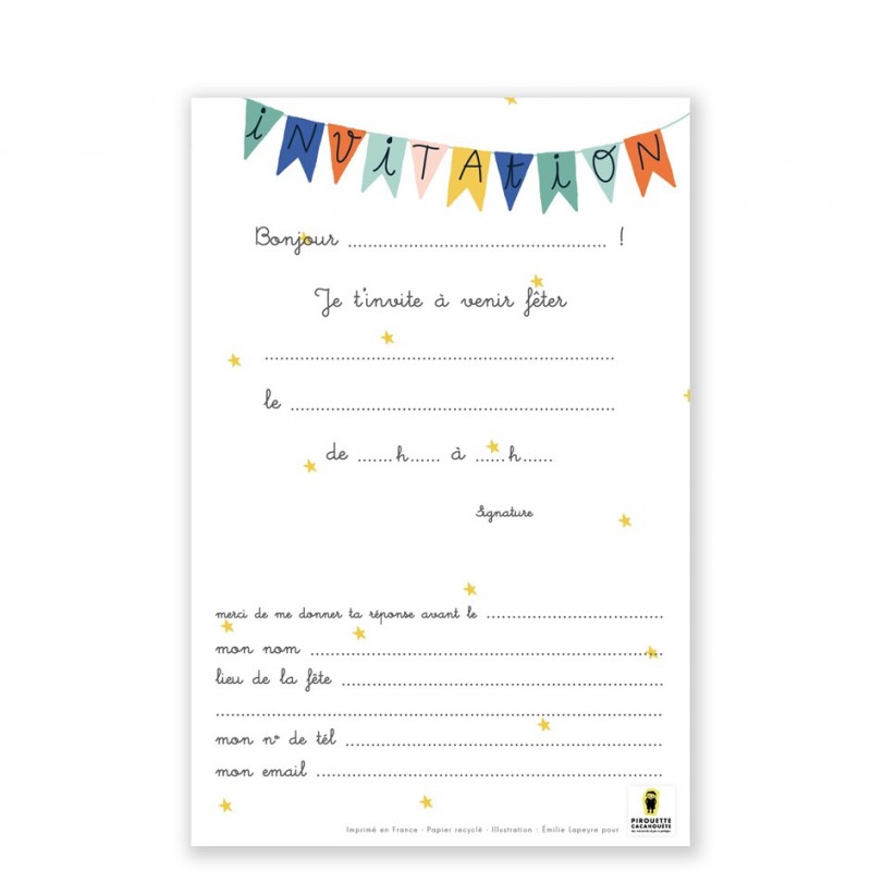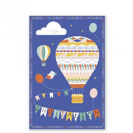 Beautiful hot-air balloons are featured in this birthday invitation cards with text (in french) to fill in and give to your guests.