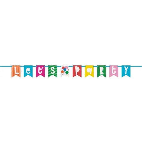 This cute multicolour flags banner is perfect for every party! Made in cardboard, features the message "Let's Party".