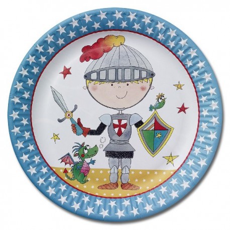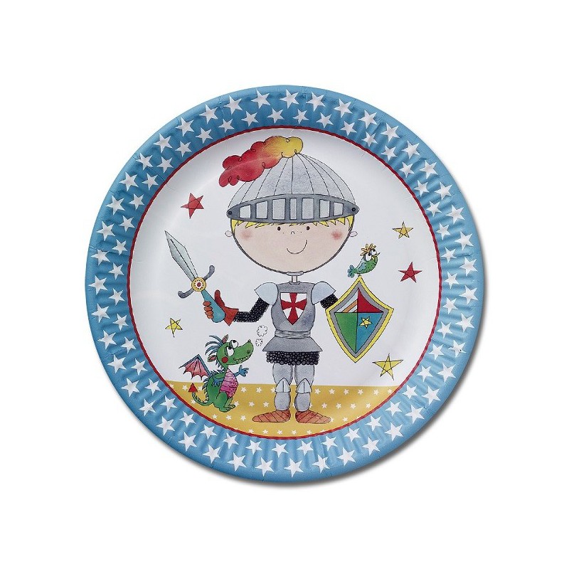 A friendly knight and his little dragon decorate these wonderful paper plates from Rachel Ellen Birthday Knight party supplies, perfect for youngest boys original birthday parties!