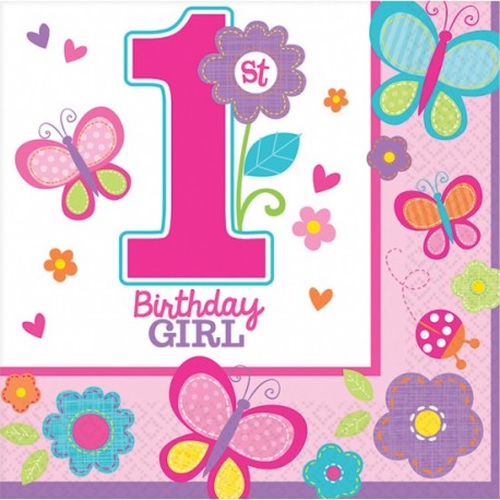 Butterfly First Birthday paper Napkins. Mix and match with other Butterfly themed articles and pink accessories and decorations to create a personalized party for your little girl!