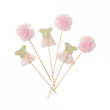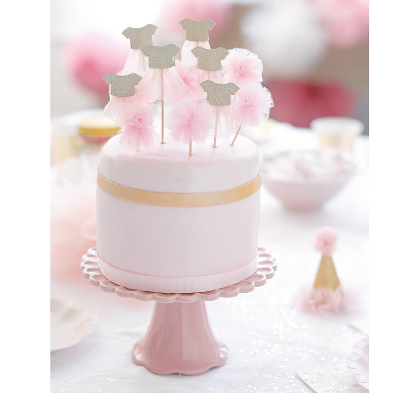 This sweet cake picks set with pink tulle tutus and pom poms is perfect to decorate ballerina's party cakes!