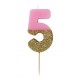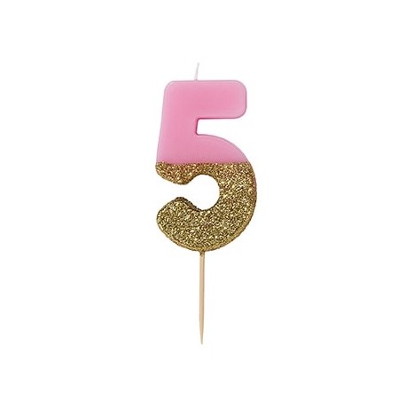 This pink number 5 candle has a part dipped on golden glitter and is just perfect to decorate girl's fourth birthday cakes.