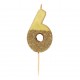 This number 6 gold candle has a part dipped on golden glitter and is just perfect to decorate birthday cakes.