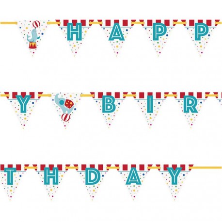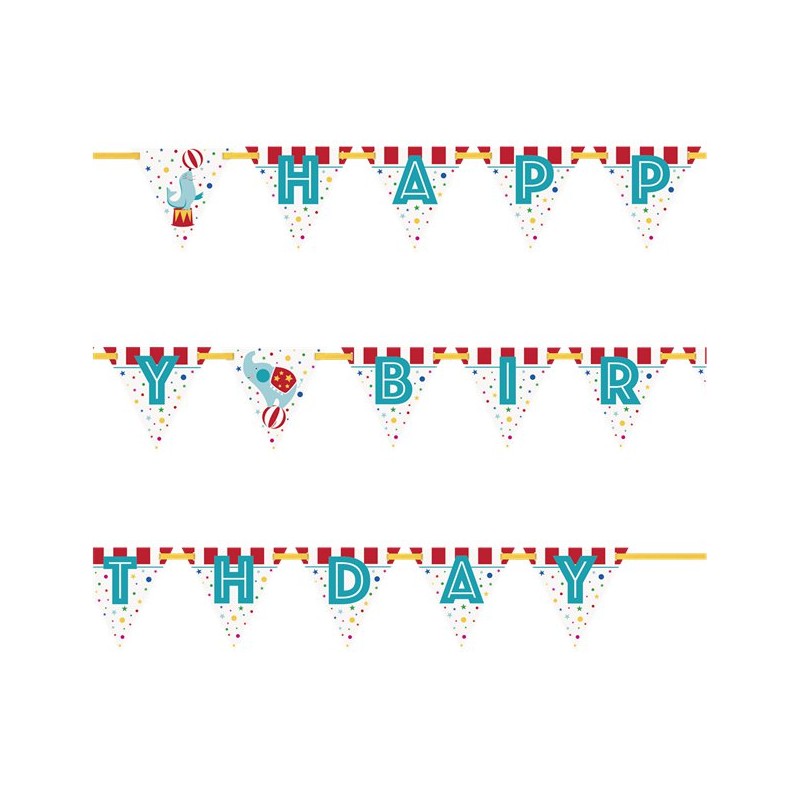 Wonderful Circus Carnival Flags Banner with "Happy Birthday" message. Made in cardboard in white backgroud, featuring Circus characters and multicolor dots and stars. Combine with other Circus Carnival articles for a complete Circus party decoration!