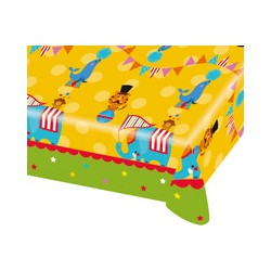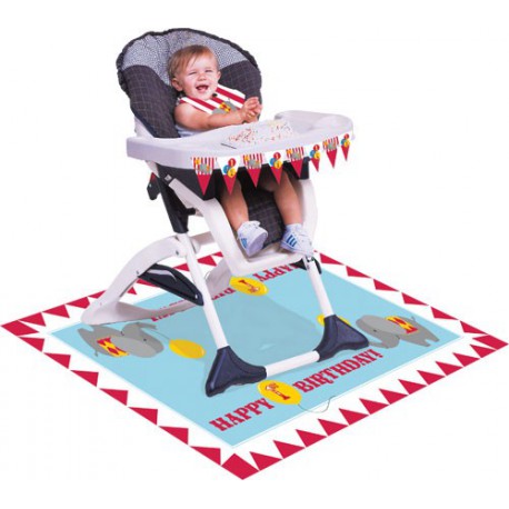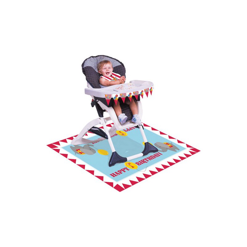 Combine this high chair kit with other Circus Time products... his/her first birthday party will be unforgettable. Kit includes one mini plastic pennant banner, one plastic floor mat and one plastic bib.