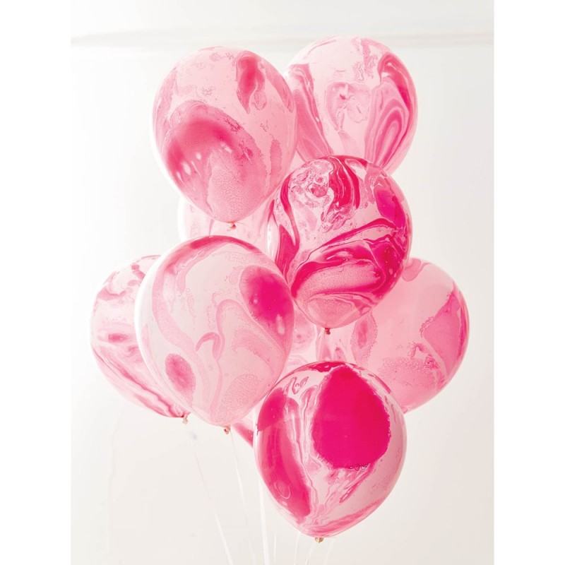 Create a trendy decoration to your party with marble effect balloons! This set contains 12 lattex balloons in 3 different designs (pink marble, pink and white pearl) and is complete with 20m of ribbon. Use our disposable helium tanks to fill and make them fly separately or together in a stunning bouquet!