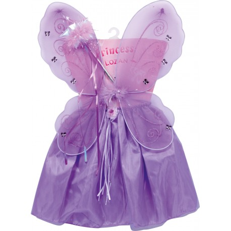 It seems to be arrived from a fairy tale, this light purple satin dress with tulle fairy wings and magic wand. Satin ribbons and pearls decorate the dress and the wand.