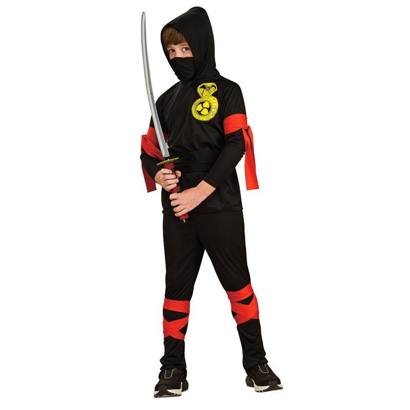 Ninja Boys Carnival Costume. Hooded shirt, face scarf, trousers, waist sash, arm and leg ties. Sword not included.