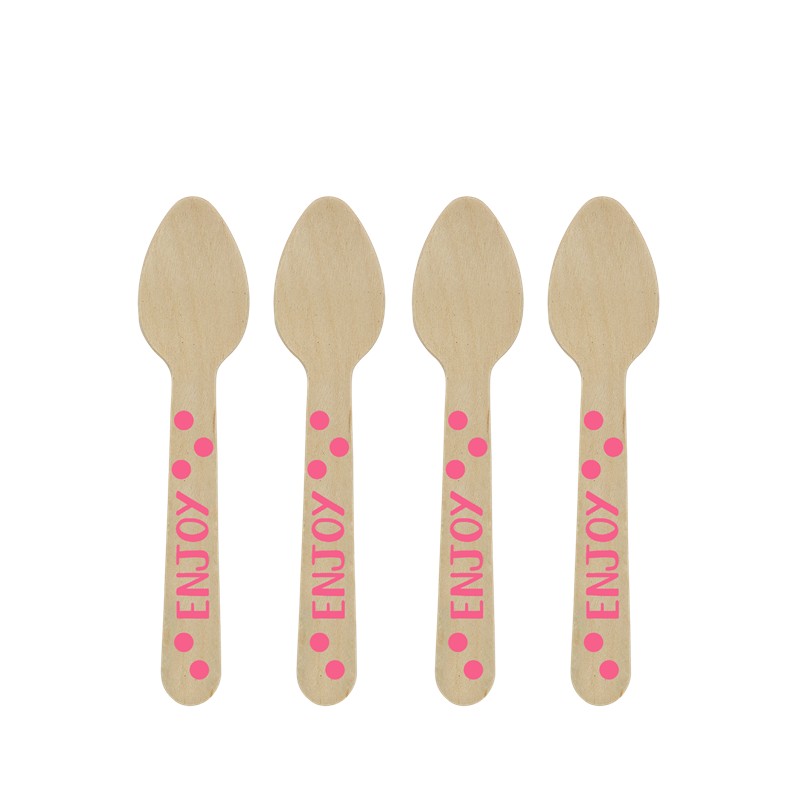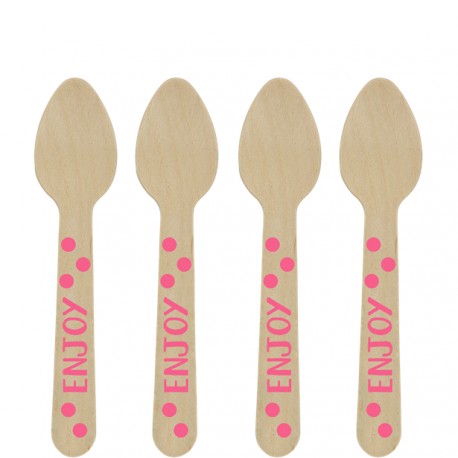 These wooden mini spoons are decorated with pink dots and the message "Enjloy". They are perfect for ice cream!