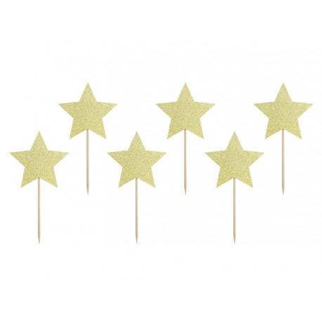 This set of 6 gold glittery paper star toppers can be used to decorate birthday cake, cupcakes or even the complete buffet!