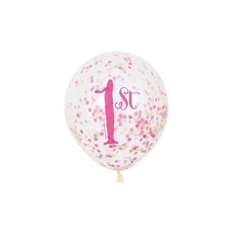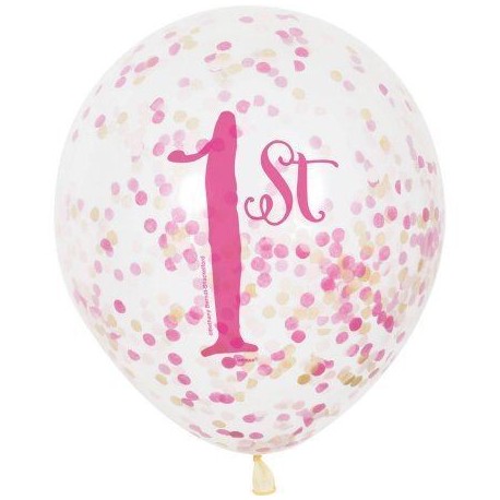 These Pink and Gold Confetti Balloons are lovely to decorate girls first birthday parties! Before inflate it with air and/or helium, insert a bit of confetti in each balloon (using the included small funnel). To make confetti remain dispersed, just to rub the balloon against a carpet.