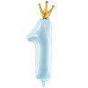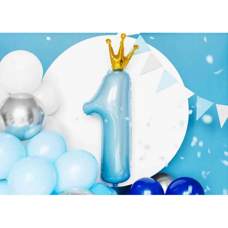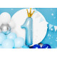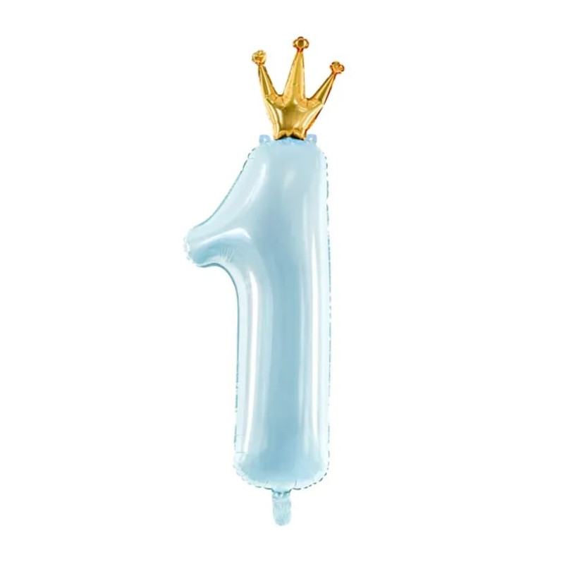 Number 1 light blue giant foil balloon with a golden crown, for boys first birthday party. Can be inflated with helium or air. (It is not sent inflated).
