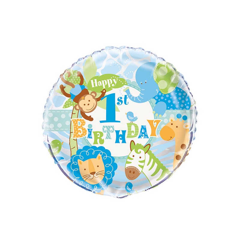 Blue Safari foil balloon, decorated with jungle animals (monkey, elephant, lion and giraffe). Perfect for boys first birthday parties!