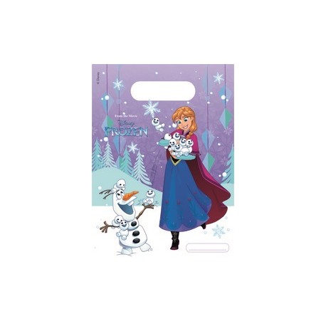 Frozen Snowflakes plastic party bags featuring Anna and Olaf, to be filled with treats and gadgets and be given to your Frozen pary invitees as going home favor. Combine with other Frozen articles to an amazing decoration!