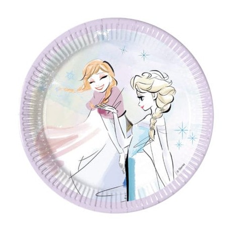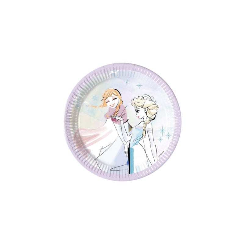 Frozen Sparkle paper dessert plates for Frozen themed kids birthday parties, featuring Elsa and Anna in lovely pastel colors. Combine with other Frozen articles to an amazing decoration!