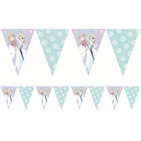 Frozen Sparkle plastic flags banner to decorate Frozen themed kids birthday parties, featuring Elsa and Anna in lovely pastel colors. Combine with other Frozen articles to an amazing decoration!