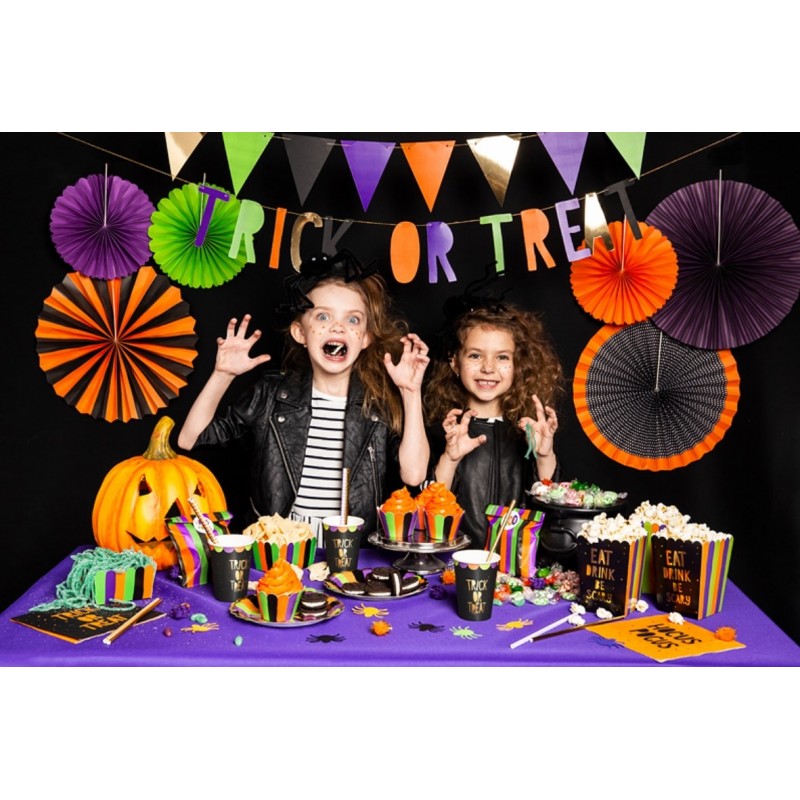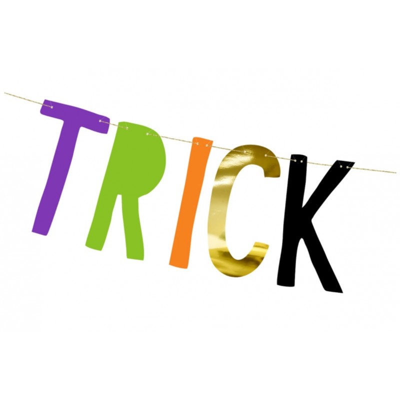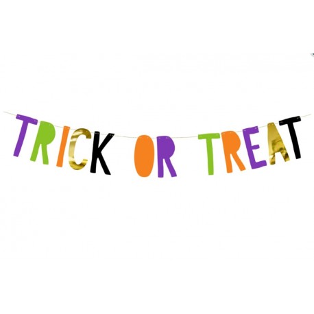 This "Trick or Treat" banner set, with the perfect colors combination for Halloween kids party decorations, includes the letters in paper and gold foil and approx. 2 m of gold twine.