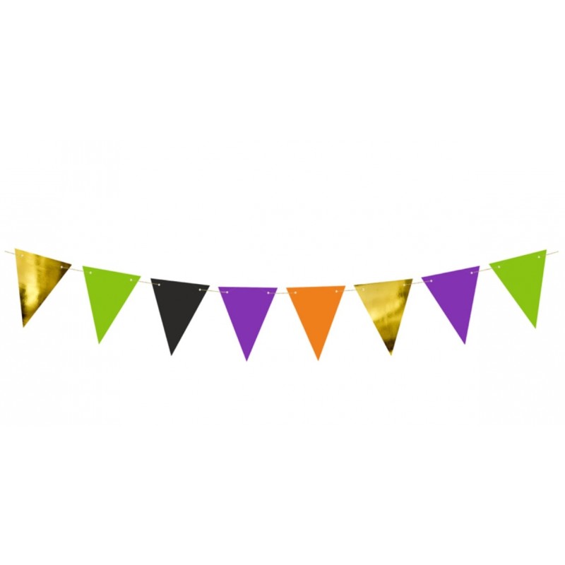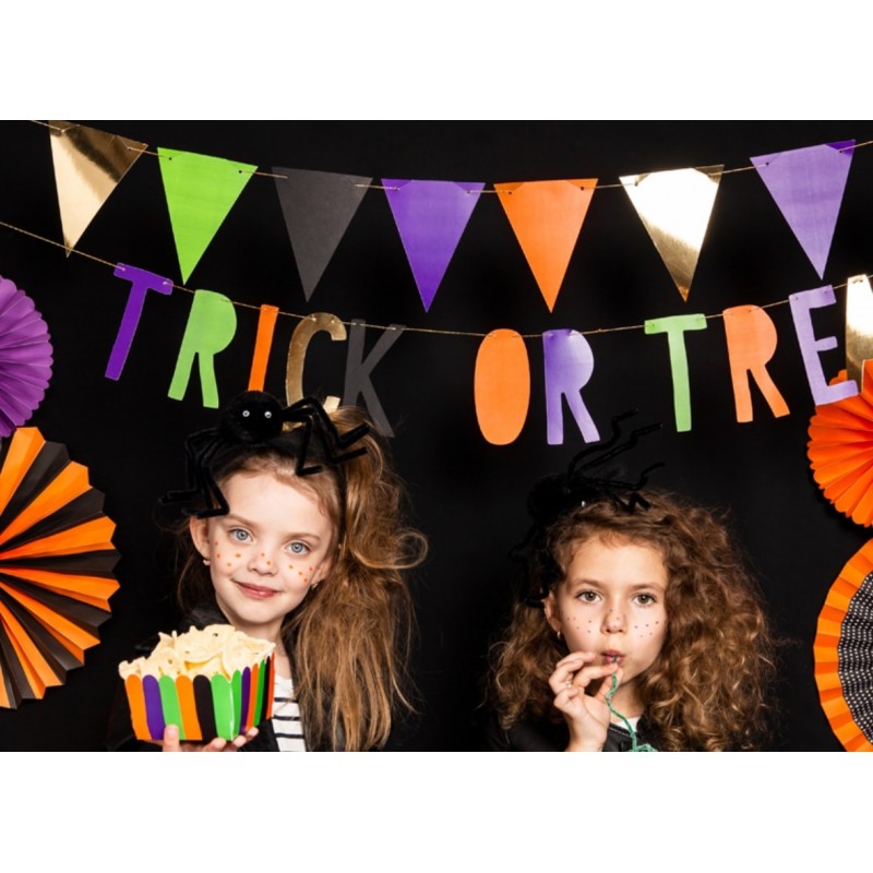 This Halloween flags banner set, with the perfect colors combination for Halloween kids party decorations, includes 8 flags in paper and gold foil and approx. 2 m of gold twine. Match to other Trick or Treat party range articles.