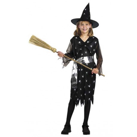 Black with spiders witch costume for kids on Halloween and Carnival parties. Contains hat, dress and belt. Broom is not included.