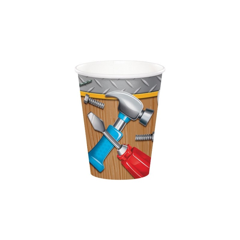 Handyman Party theme paper cups featuring the tools that fascinate boys. Combine with other Handyman theme items, cutlery and balloons in the solid colors you prefer for a perfect decoration!