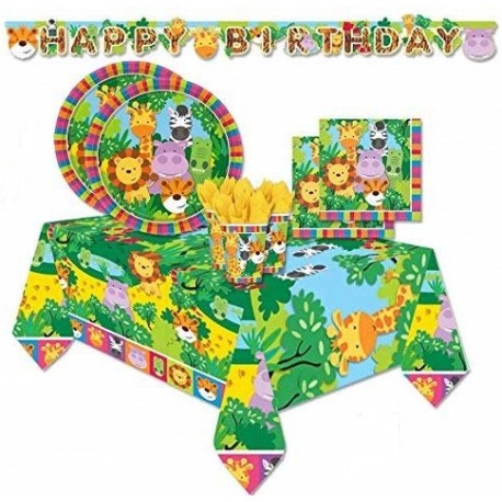 This convenient Jungle Friends party kit is complete with 24 plates, 24 cups, 40 napkins, 1 tablecover and 1 Happy Birthday banner featuring cute jungle animals (lion, zebra, tiger, hypopotamus, crocodile), super colorful and funny, ideal to jungle themed birthday parties! Match to other Jungle Friends party range articles, accessories and decoration in the colors you prefer.