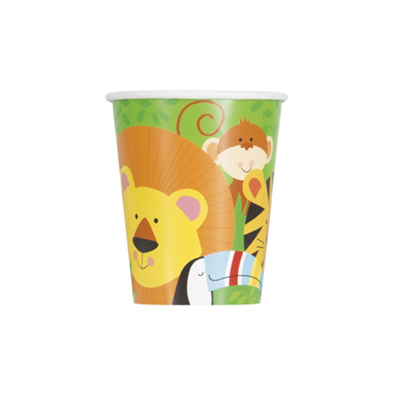 Paper cups featuring cute jungle animals (lion, zebra, tiger, monkey, tucano), super colorful and funny, ideal to jungle themed birthday parties! Match to other Jungle party range articles, accessories and decoration in green or orange.