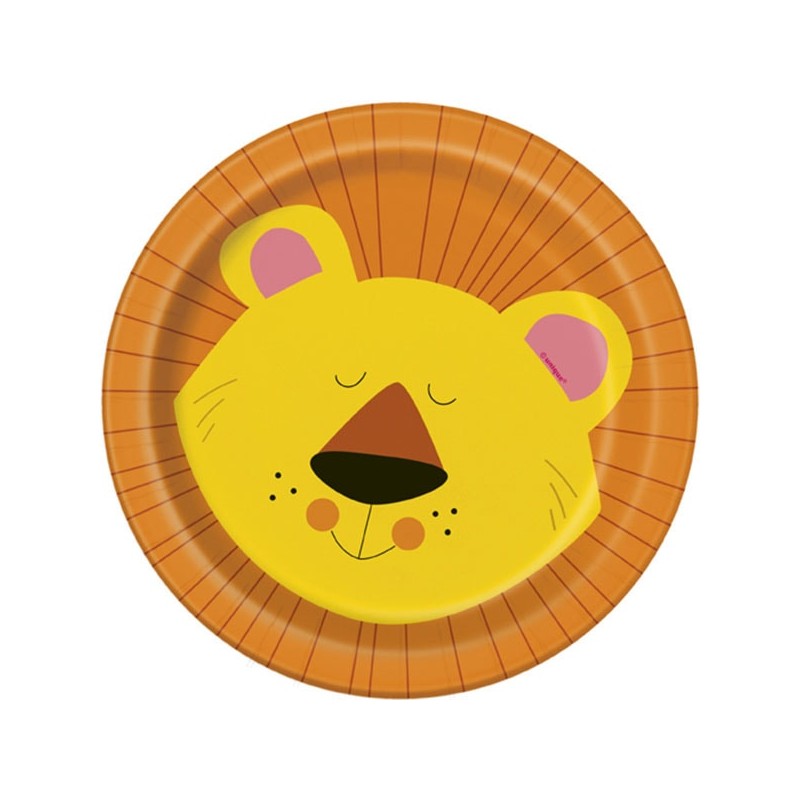 Paper plates featuring a cute lion, super colorful and funny, ideal to jungle themed birthday parties! Match to other Jungle party range articles, accessories and decoration in green or orange.