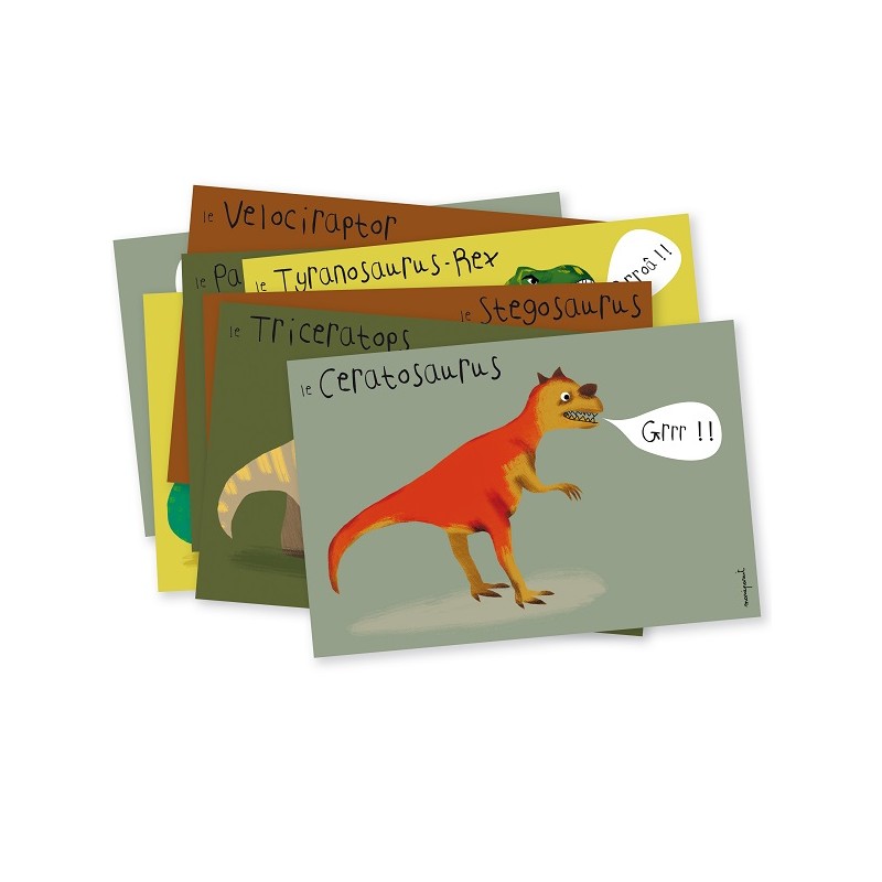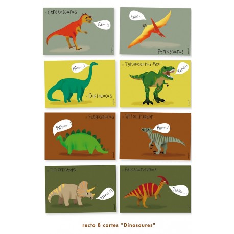 Dinosaurs themed invitation cards (8 different models) with text to fill in and give to your guests. Information are written in French.