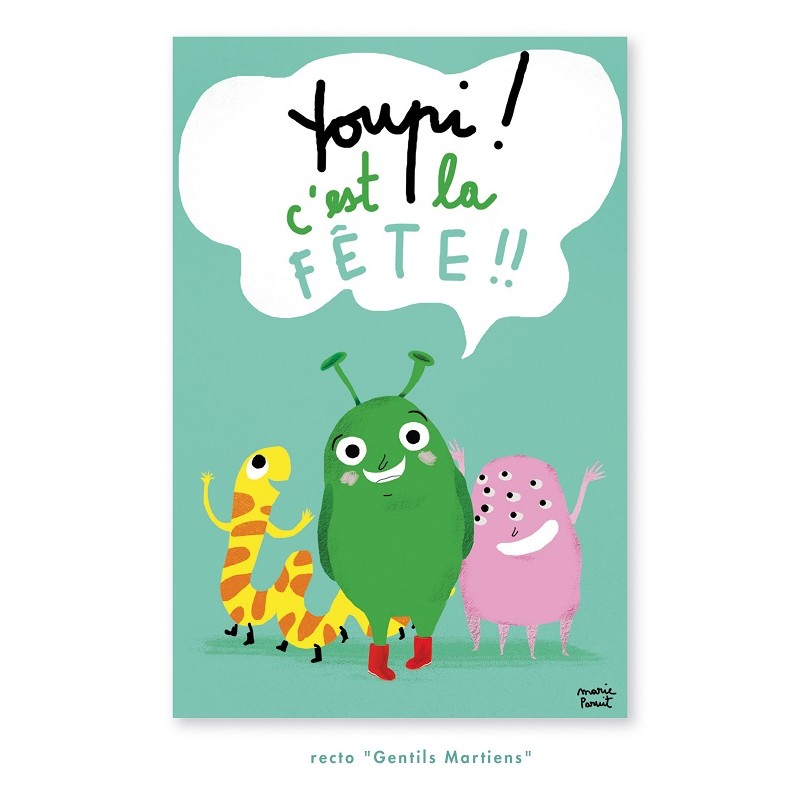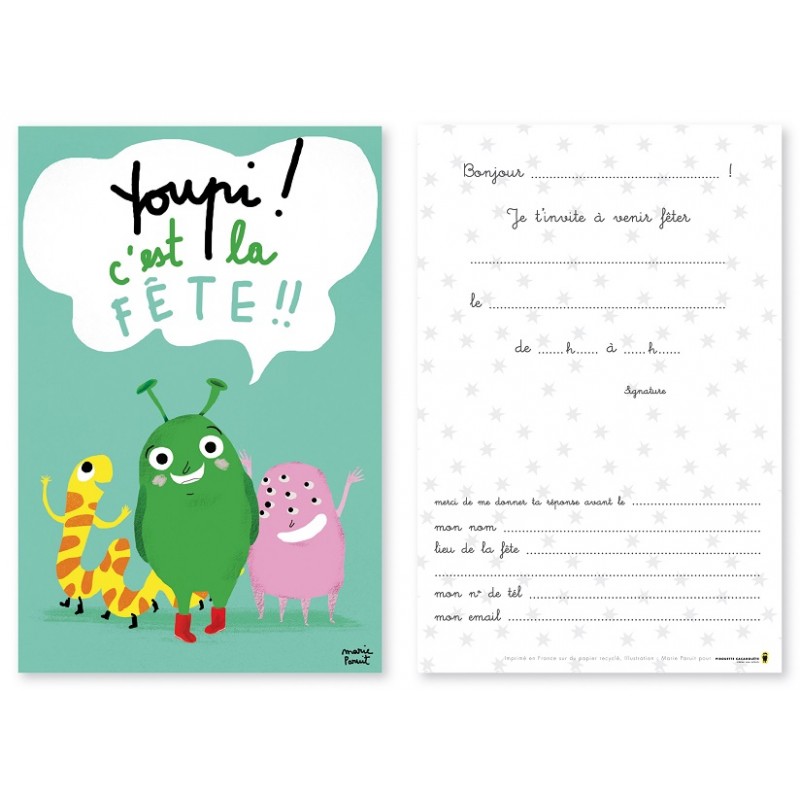 Friendly little monsters are featured in this birthday invitation cards with text (in french) to fill in and give to your guests.