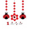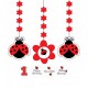 Ladybug Fun hanging cutouts for girls birthday party. Combine with other ladybug items, red and black cutlery and balloons for a perfect decoration! Includes 4 stickers ("First Birthday", "Happy Birthday!", "Baby Shower" and "It's a Girl!") to customize the cutouts according to your celebration.