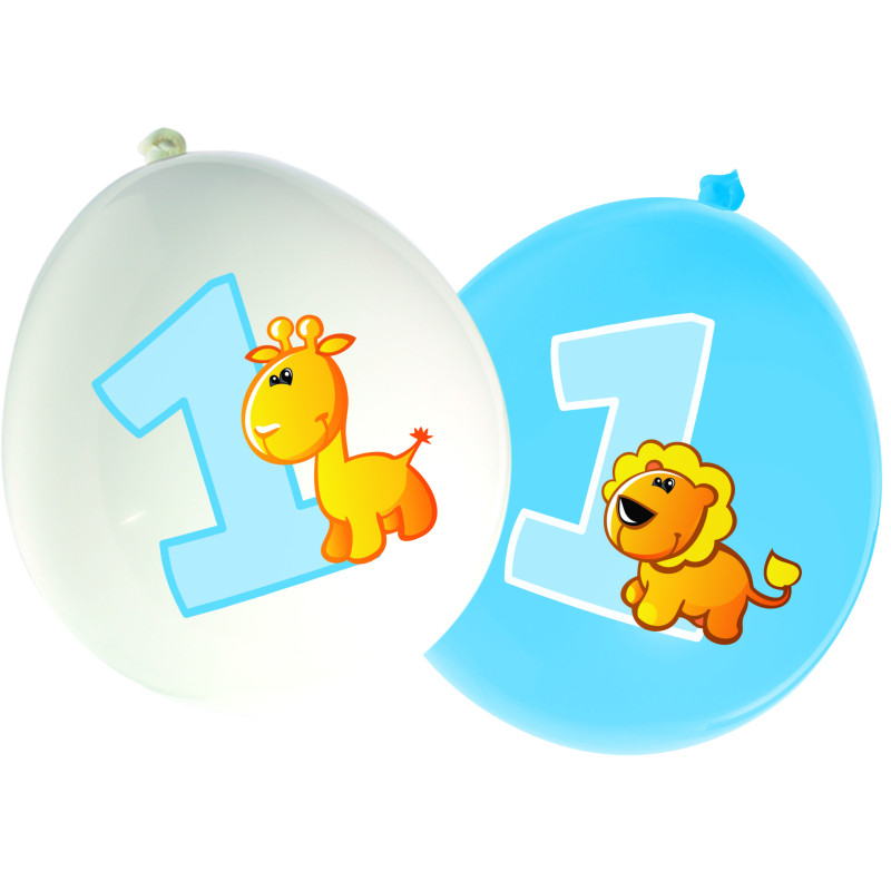 Little Animals first birthday latex balloons set in blue and white colors, perfect to decorate boys first birthday party.