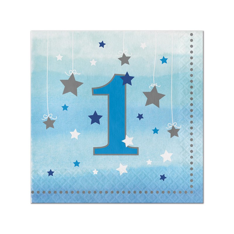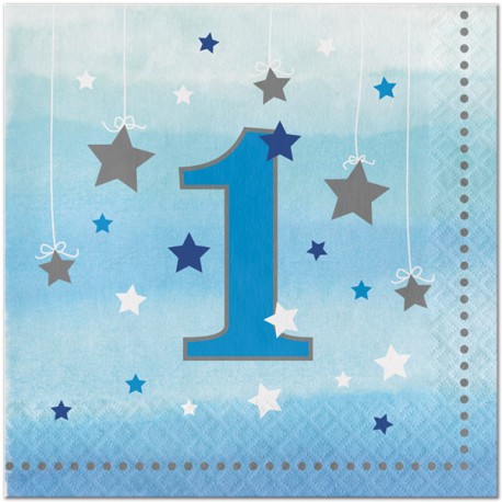 These light blue paper lunch napkins features a number 1 and blue, gold and white little stars are perfect for boys first birthday parties! Match to other Little Star articles and light blue and gold accessories.