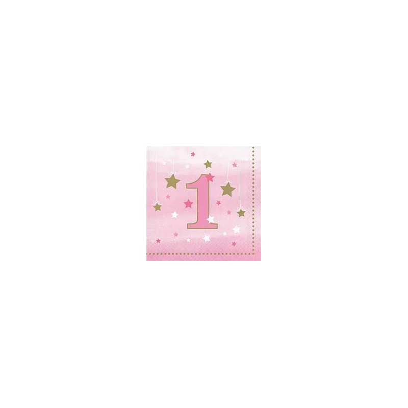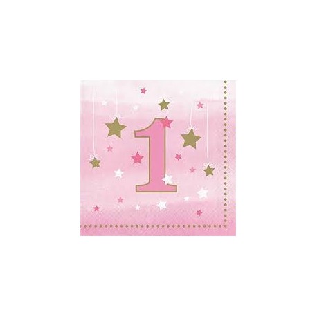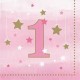 These light pink paper lunch napkins, featuring a number one and pink, gold and white little stars, are perfect for girls first birthday parties! Match to other Little Star articles and pink and gold accessories.