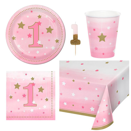 Little Star Girls First Birthday Party Set in pink and gold colors, including: